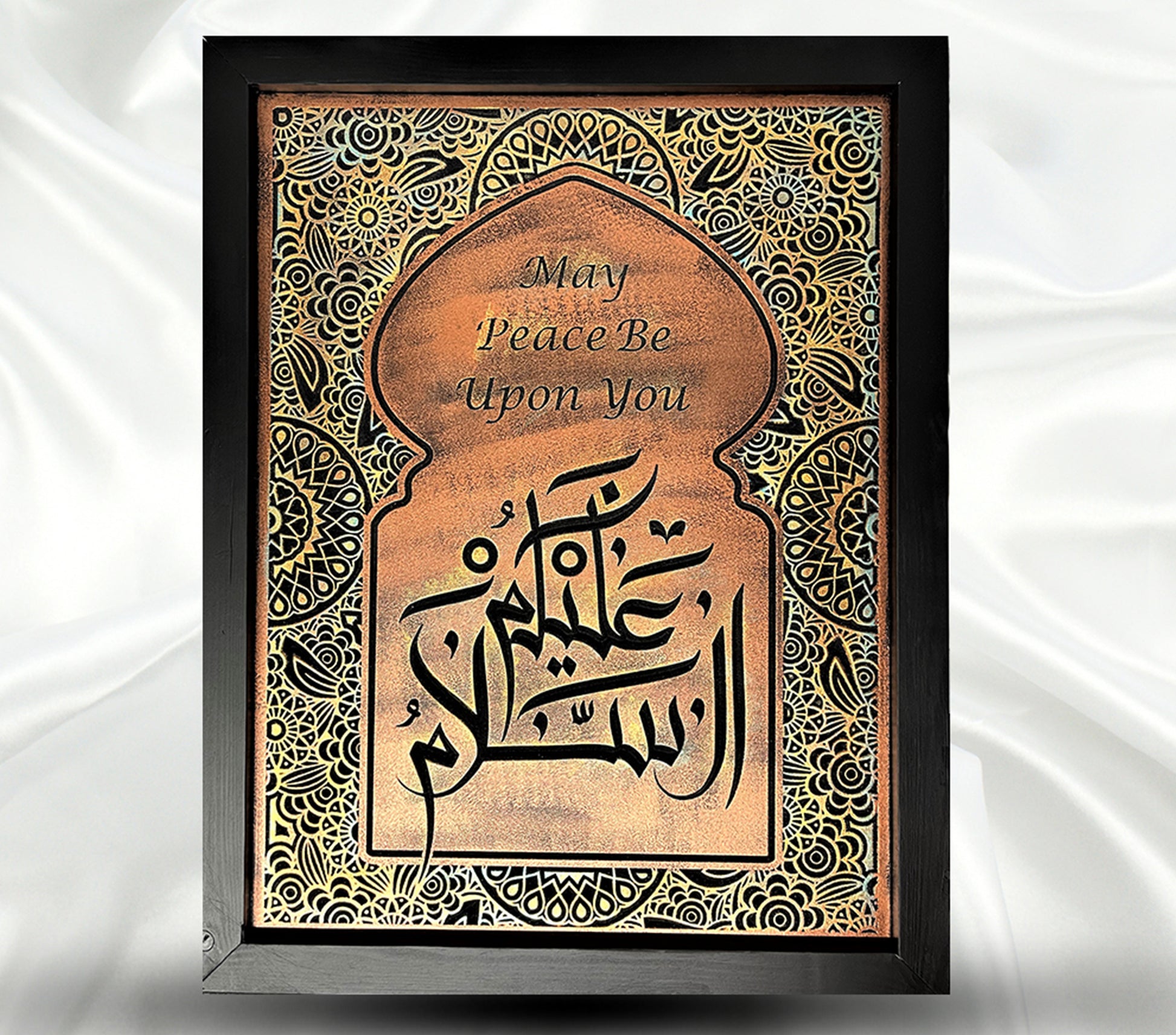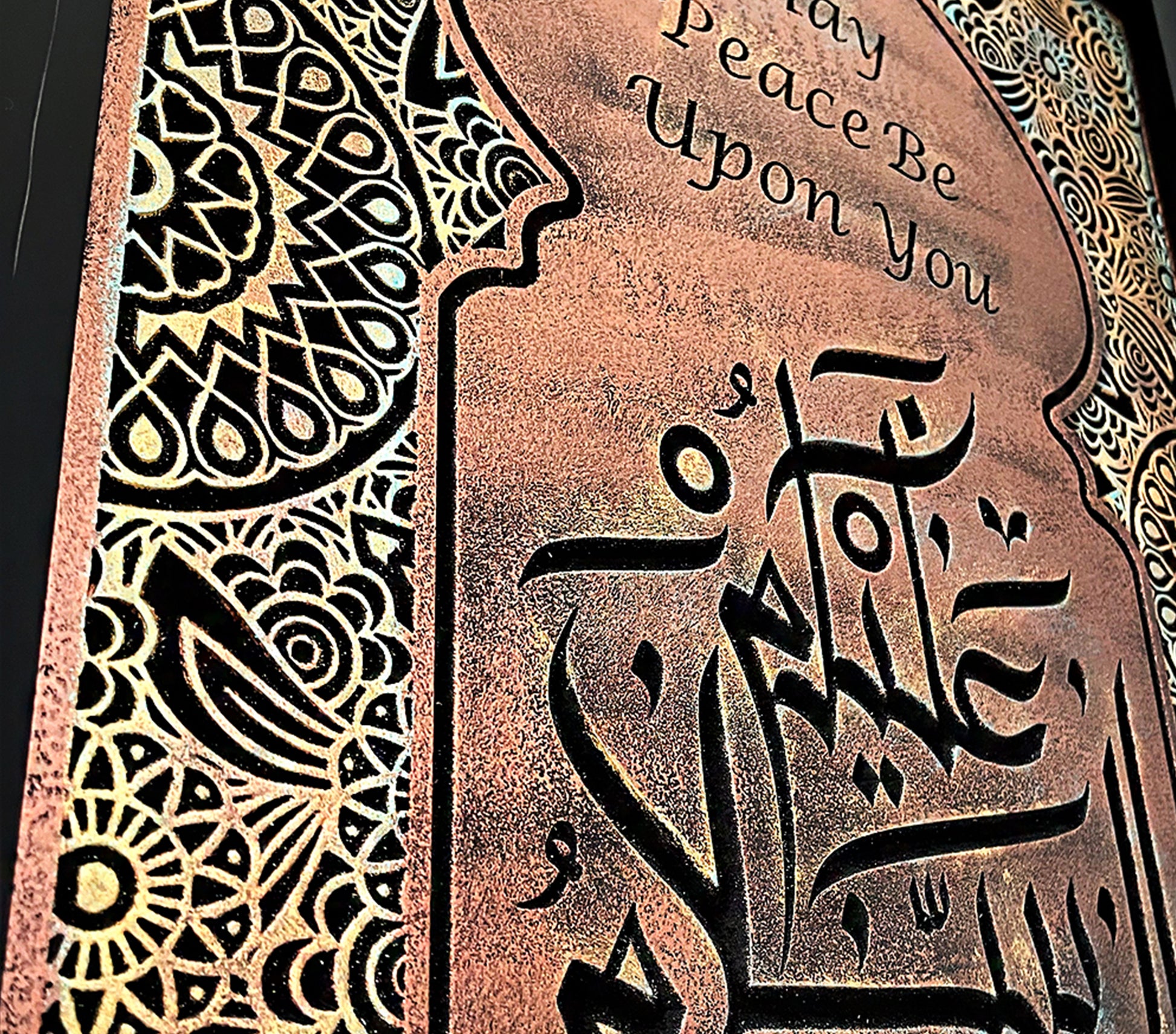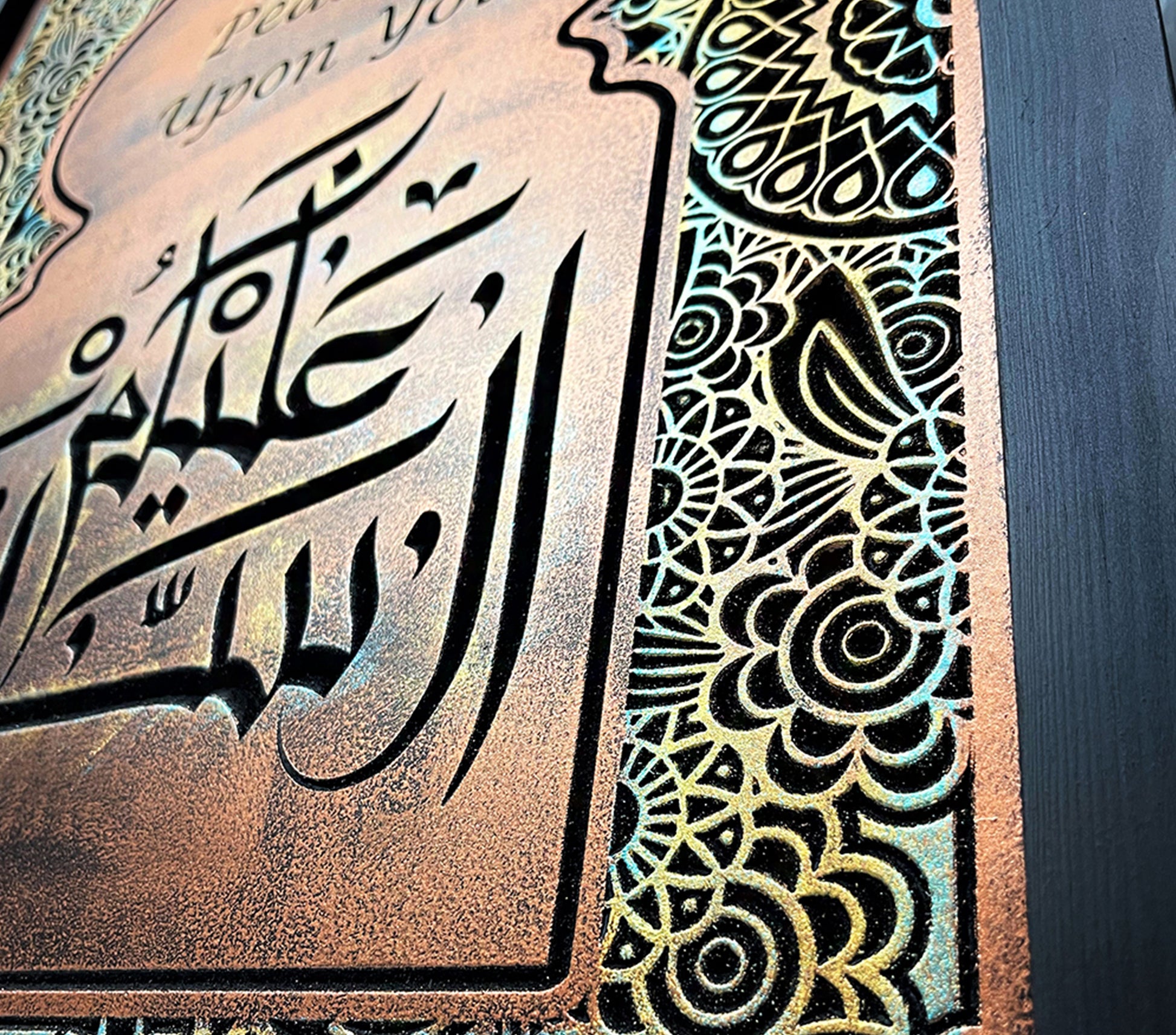 Machine carved on MDF surrounded with pine wooden frame. Hand painted with copper,gold,blue and black acrylic paints . Can be gently wiped with damp lint free cloth. Colours and finishes may vary slightly due to being hand painted.
